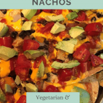 Tortilla chips are the bottom layer, then I add any “warm toppings” – in this case onions, garlic, black beans, peppers and shredded cheese, add another layer of chips and then “warm toppings” again. You can do this in 2-3 layers, and then add the “fresh toppings” – such as avocado, tomatoes and salsa.